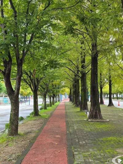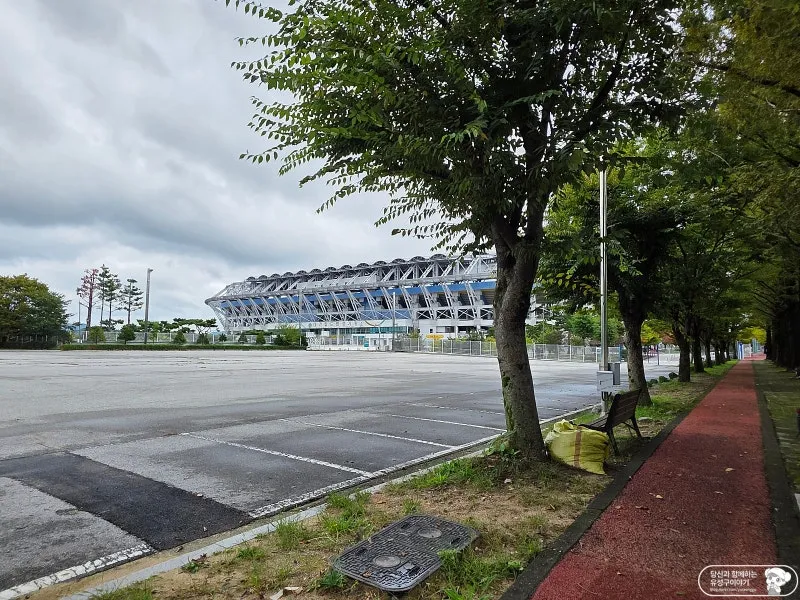 축구 경기가 있는 날에는 자리가 차는 곳이지만 경기가 없는 휴일에 방문하였더니 주차해 둔 차가 하나도 없는 것을 볼 수 있었습니다. 사진 속 보이는 인도는 양옆으로 가로수가 빼곡히 심겨 있어, 마치 작은 메타세쿼이아 길을 떠오르게 하는 산책하기에도 좋은 곳입니다.