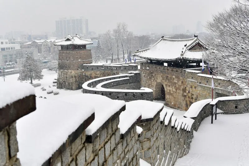 눈이 내리면 성곽과 누각이 하얗게 덮이며