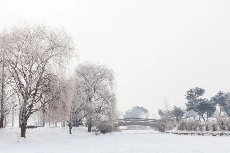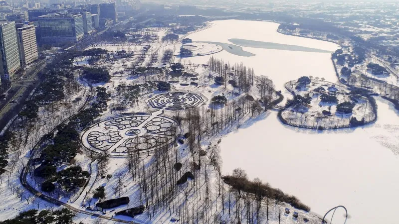 넓은 호수와 수목이 흰 눈으로 덮이며