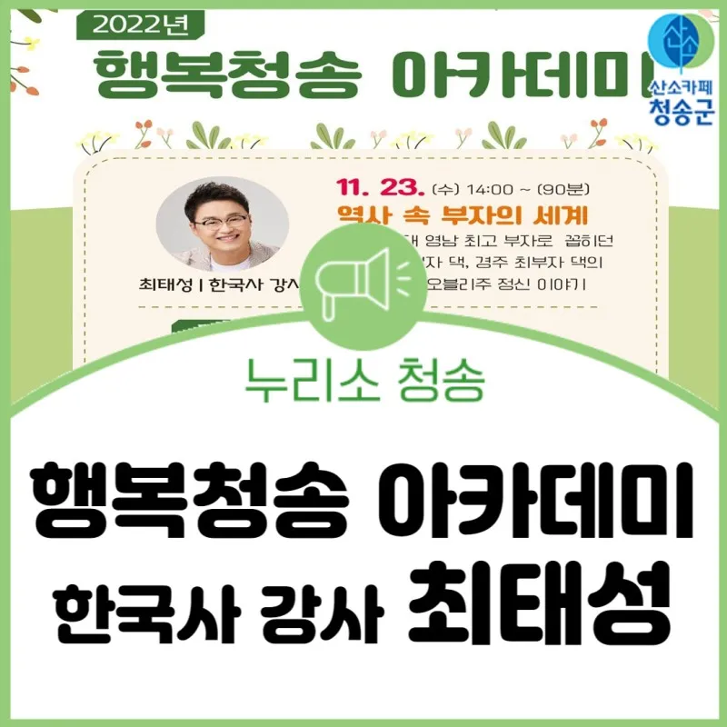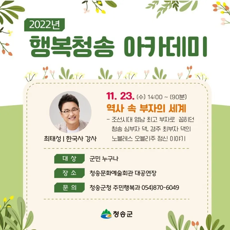 『행복청송 아카데미』 11월 강연, 최태성 강사 '역사 속 부자의 세계'