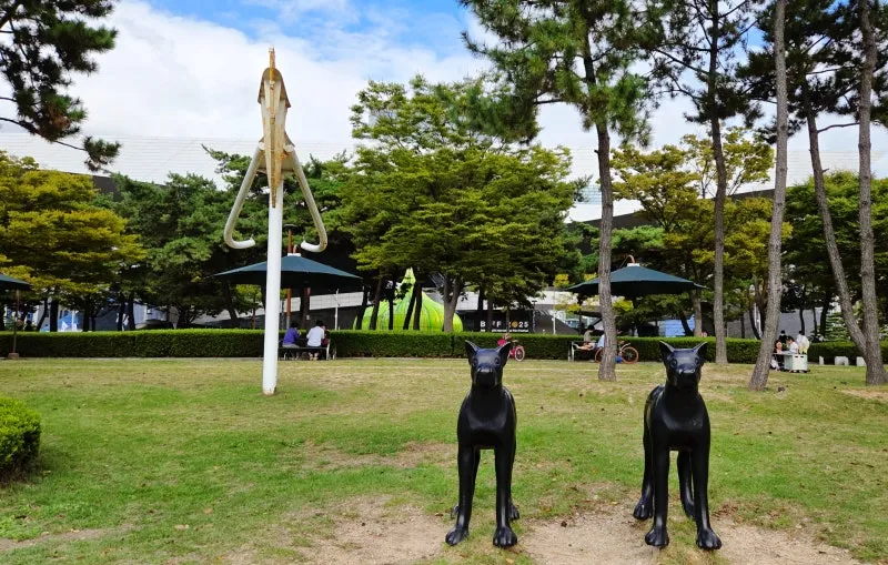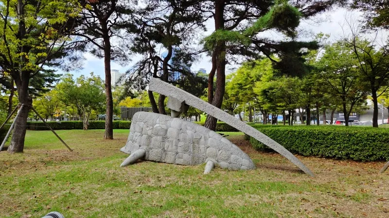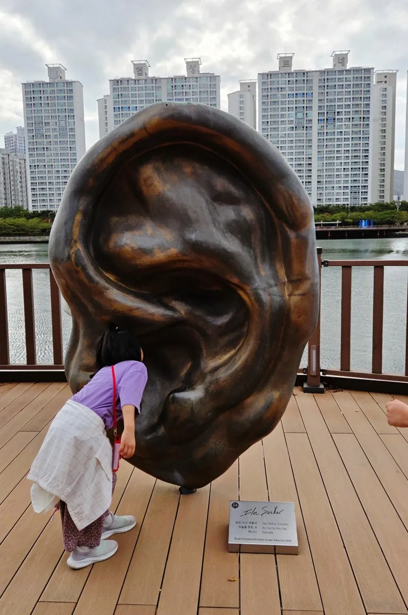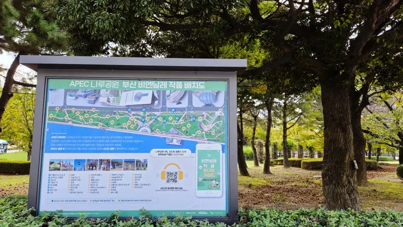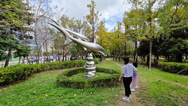 APEC 나루공원의 또 하나의 매력은 산책길을 걷다 보면 곳곳에서 만날 수 있는 부산비엔날레 조각 작품들입니다. 하나하나의 작품이 수영강변의 자연 풍경과 조화를 이루며, 걷는 길 전체가 마치 야외 미술관처럼 느껴집니다.