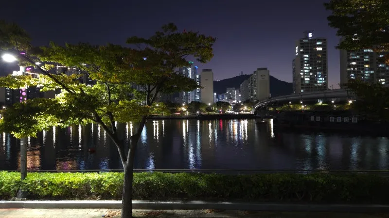 밤의 수영강변을 천천히 걷다 보면, 잔잔히 흐르는 물결 위로 하늘빛이 은은하게 반사되어 마치 강이 별빛을 품은 듯 반짝입니다.