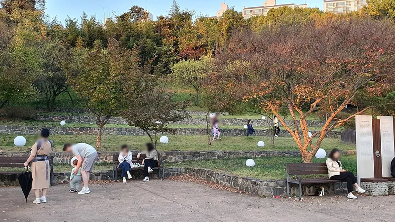 동춘당 곳곳에서 여유있는 가을날의 오후 시간을 보내는 시민들의 모습입니다. 해가 질 무렵의 시각이니 기온은 10도 후반인데, 외국인 부모는 둘 다 아직도 반팔 차림입니다.