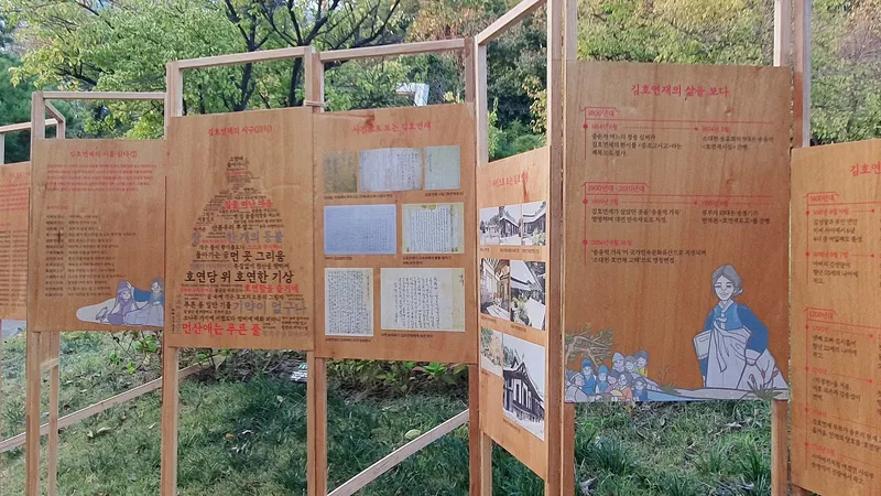 소대헌 호연재 고택의 옆문은 닫혀있고 그 앞에는 호연재 김씨의 이야기를 전시한 병풍식 판을 세워 놓았습니다. 특히 눈길을 당긴 것은 비녀를 꽂고 한복을 입은 여인의 형상을 김호연재의 시구로 그려 넣은 것입니다.