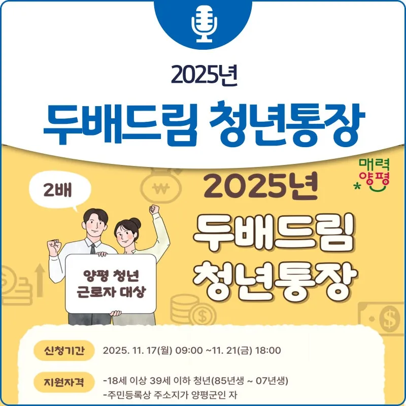 ▪️신청방법: 온라인신청(‘잡아바어플라이’ 〉‘양평’검색 〉두배드림 청년통장)