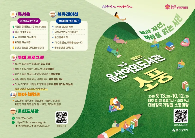 울산도서관은 오는 9월 13일부터 10월 12일까지 매주 토·일요일 태화강 국가정원 소풍마당에서 울산 야외도서관 '소풍'을 운영합니다.