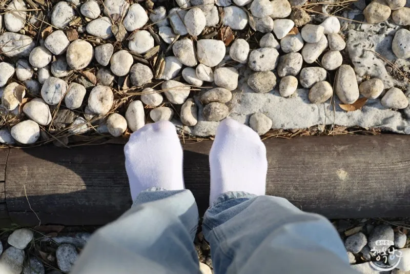 날씨가 추워서 저는 맨발 체험은 어려웠고요. 양말을 신은 채 자갈밭과 통나무 위를 걸으며 발 지압을 해주었습니다.
