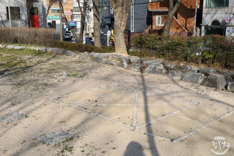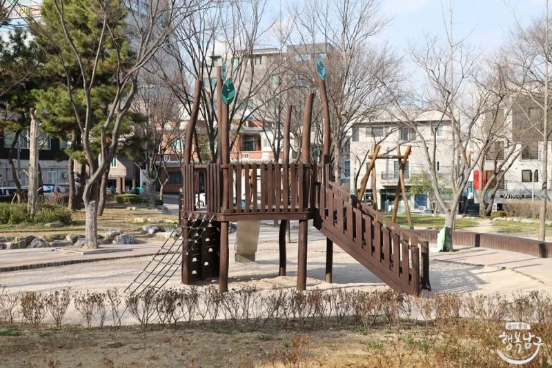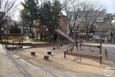 나무 구조물로 만들어진 미끄럼틀과 바닥엔 땅따먹기 그림도 있습니다.