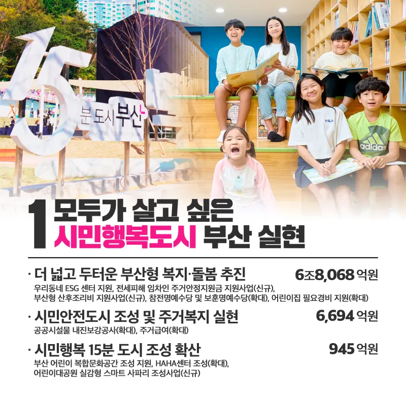 [부산형 복지‧돌봄 실현: 6조 8천68억 원] 더 넓고 두터운 복지·돌봄을 추진합니다. 사회 취약계층에 대한 사회 안전망과 기초생활 지원을 확대해 자립과 성장을 함께 지원합니다.