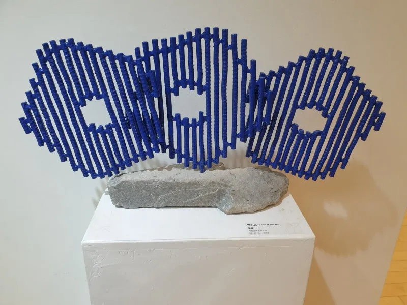 폐철근에 분채도색한 작품으로 전시 중인 조각작품들 재료가 어느 하나 같은 게 없이 다양하게 이용되었네요