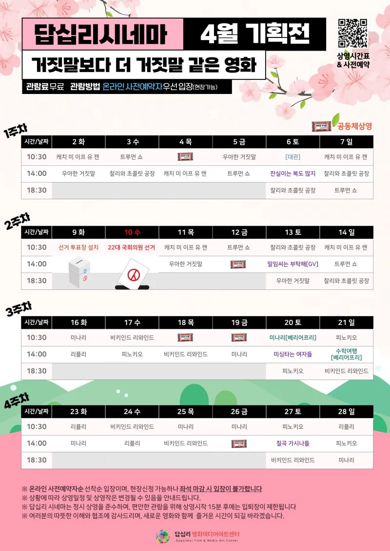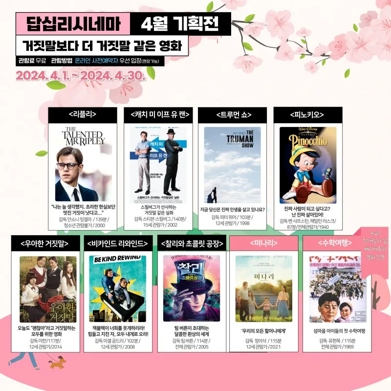 우리동네에서 편하게 영화보기 좋은 '답십리 시네마' 4월 기획전은 <거짓말보다 더 거짓말 같은 영화>입니다🎬 |