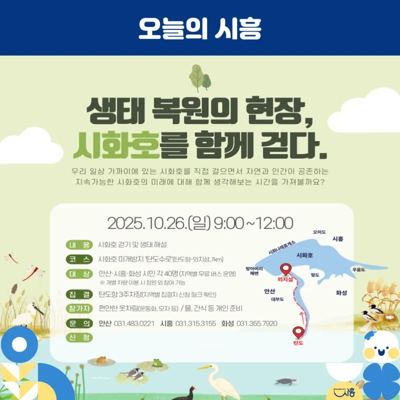 특히 평소 출입이 제한된 시화호 미개방지 구간인 탄도수로(탄도항~외지섬)에서 진행돼, 시민들이 직접 생태복원 현장을 걸으며 체험할 특별한 기회를 제공합니다.
