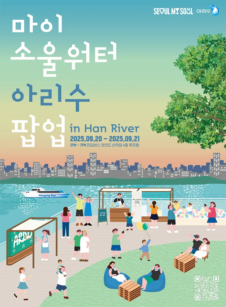 ‘마이소울워터, 아리수’ 팝업 ○ 날짜: 2025년 9월 20일 ~ 9월 21일 ○ 시간: 오후 2시 ~ 오후 7시 ○ 장소: 한강버스 여의도 선착장 4층 루프톱 |
