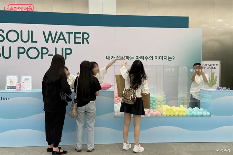팝업에 참여한 시민들은 ‘내가 생각하는 아리수 이미지’ 투표를 시작으로, 정수 과정을 체험할 수 있는 ‘워터 플로우’, 스텝퍼 게임 방식으로 물을 채우는 ‘아리수 게임존’, 아리수 카페, 굿즈존 등 다양한 체험 프로그램을 즐길 수 있다.