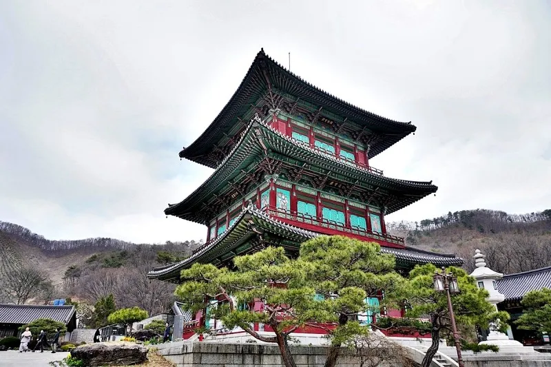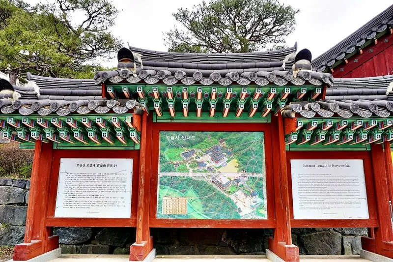 마을이 내려다보이는 언덕 위 보호수 느티나무 맞은편으로 사천왕문을 지납니다. 일주문을 대신하여 불계와 인간계의 경계선 역할을 하네요. 이어 석축을 쌓은 계단 위로 범종각과 법고각이 좌우로 웅장하게 서 있고 넓게 다져진 평지에 각각의 전각들이 이어집니다. 만뢰산 능선 아래로 포옥 안긴 사찰은 방문객들의 마음까지도 여유롭게 합니다.