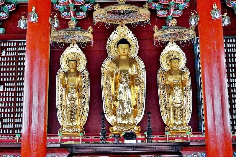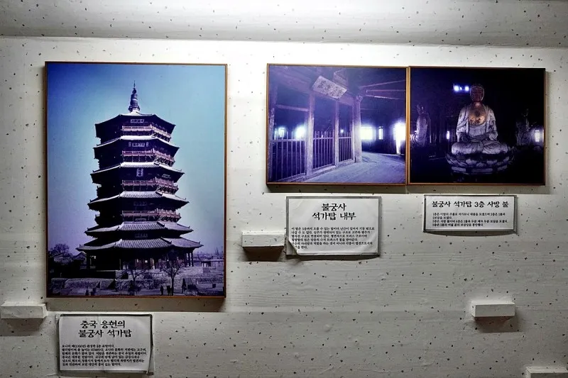 또한 실내는 3층 구조로 1층 사방불전 2층은 대장전 , 3층은 미륵삼존을 모신 미륵전입니다. 한 바퀴를 돌면 경전을 한번 읽는 효과가 있다는 윤장대, 2층과 3층 사이로는 인도, 중국, 일본, 우리나라까지 목탑의 연원을 보여주는 사진자료도 전시됩니다. 삼층 목탑의 높이는 108척, 32.7m이며 전체 높이는 54m이네요. 높이 108척은 백팔번뇌를 의미하기도 하였습니다. 3층까지 오르는 동안 그닥 높이감이 느껴지지 않았음에도 긴장해서였던 듯 다리가 후들거립니다. 부끄럽게도 미륵삼존을 향해 108배를 드리는 분도 계시네요.