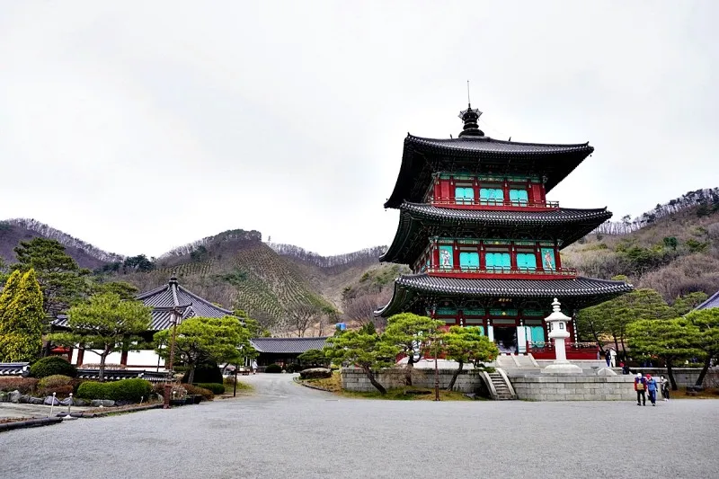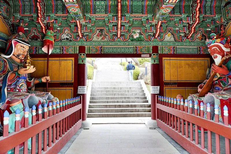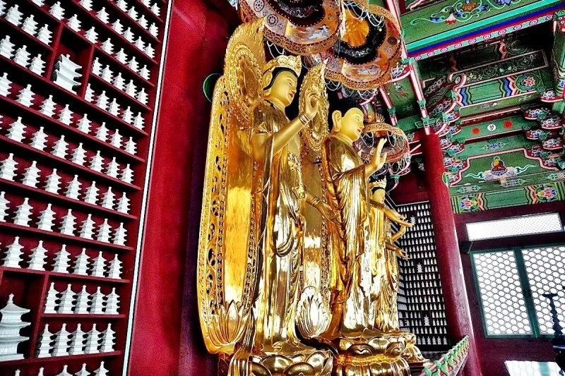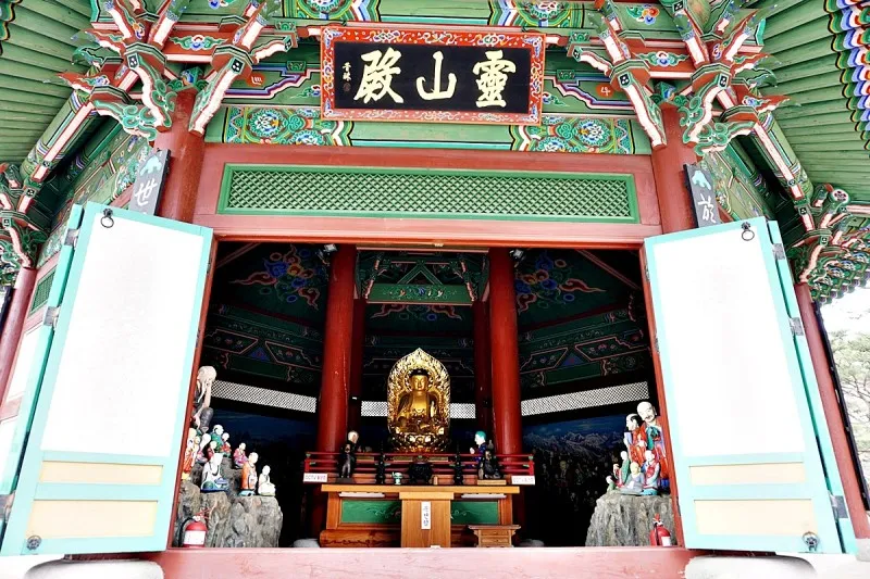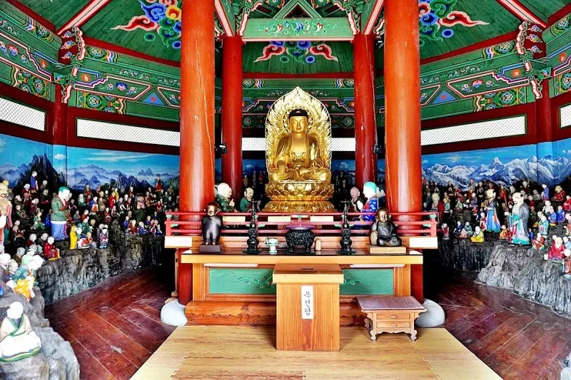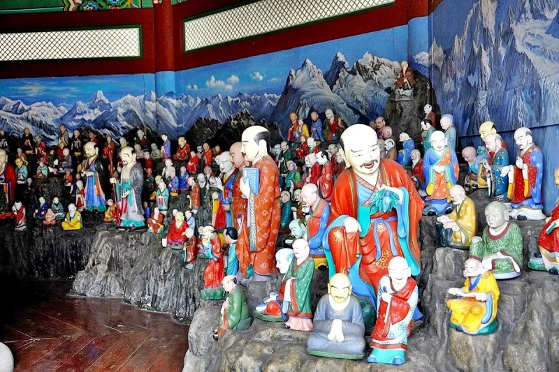 영산전은 부처가 500명의 비구들에게 설법하던 모습이 재현되었습니다. 한가운데에 부처가 모셔져있고 수려한 강산을 배경으로 설법을 듣는 비구 조형물이 빽빽하게 이어지네요. 형태도 모습도 표정도 모두 제각각으로 한참을 둘러보게 됩니다.