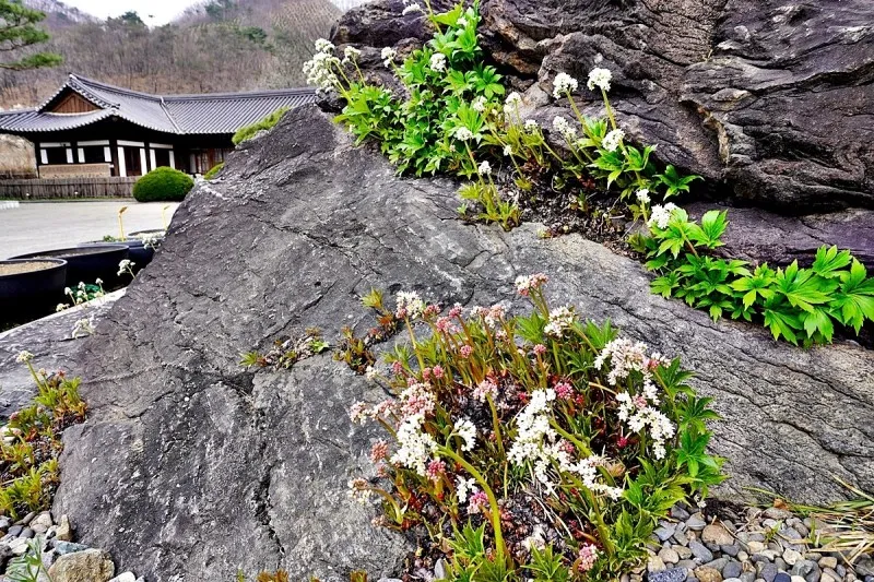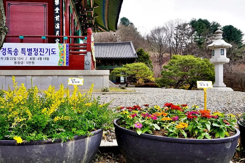 잠시 예를 올리고 물러나서는 사찰의 봄을 즐깁니다. 정원이 잘 가꾸어진 사찰은 공양 또한 꽃으로 올려지네요. 목탑 초입으로 꽃 공양소가 있고 아름다운 화단이 꾸며졌으며 돌단풍, 할미꽃, 복수초, 탑꽃 등 다양한 봄꽃들이 피었습니다.