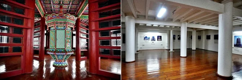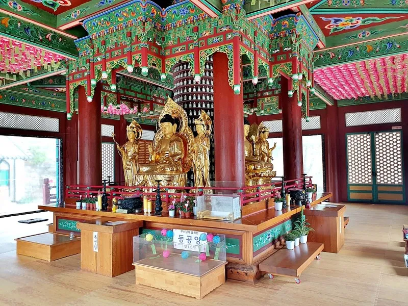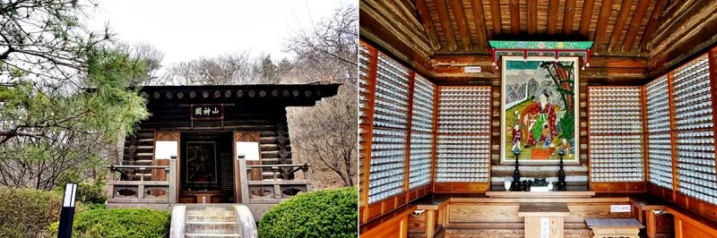 멋스럽게 서 있는 소나무 돌계단을 지나 산신각이 있습니다. 귀틀집 형식입니다. 바깥에서 볼 때와 달리 너른 공간에는 연꽃 장식 사이로 산신님이 모셔졌네요. 지금으로부터 27년 전 1996년에 창건된 사찰은 짧은 역사를 극복하는 아름다움이 있었습니다. 목조 건축의 예술을 보여주는 삼층 목탑, 산간지역의 독특한 가옥인 귀틀집이 대표적입니다.