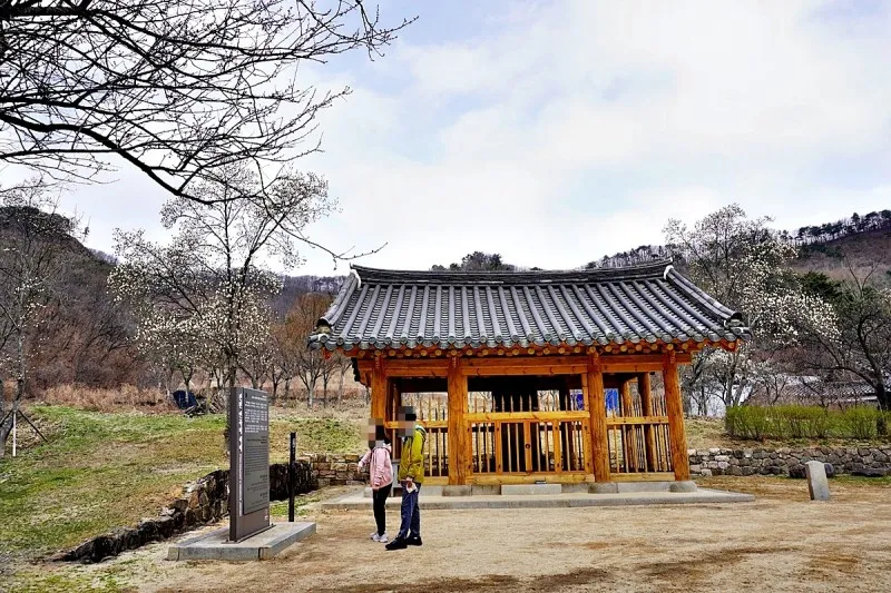 전각과 요사채 사이로는 작은 미니정원도 있습니다. 산기슭으로 진달래와 수선화가 피었으며 미쳐 이름을 알 수 없던 꽃들도 피어서는 꽃구경 삼매경에 빠져드네요. 화려한 전경에 오고 가던 모든 사람들이 사진을 담는 포토존이었습니다. 그 맞은편으로 미선나무, 목련이 호위하는 진천 연곡리 석비가 있습니다.