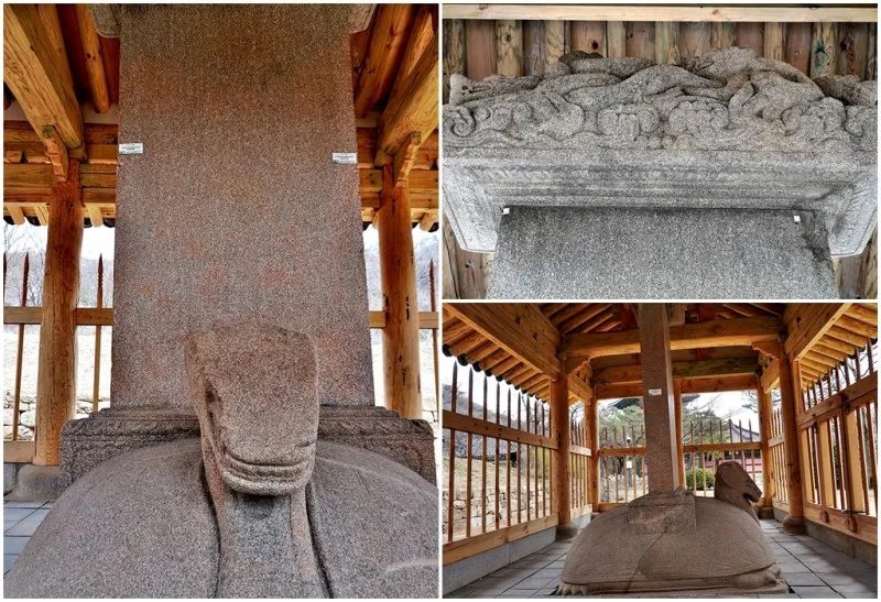 거북 받침 위에 비몸을 세우고 비머리를 얹은 일반형 석비로 비문이 없어 백비라고도 불립니다. 거북 모양의 받침돌은 얼굴 면이 손상되어 말머리같이 되었고 앞 발톱은 파손되네요. 비 머리에는 아홉 마리의 용이 여의주를 물려고 하는 모습이 사실적으로 표현되었습니다. 비석의 형태가 고려 시대 초기 양식으로 고려 시대 석비로 추정되고 있었습니다.
