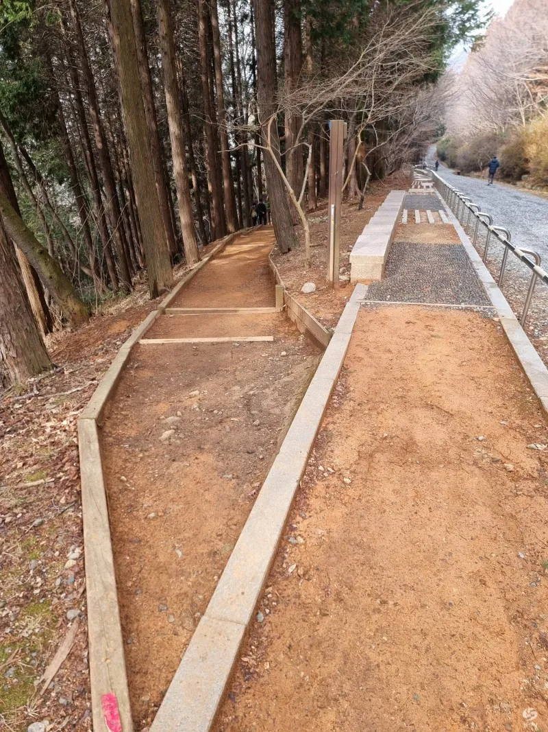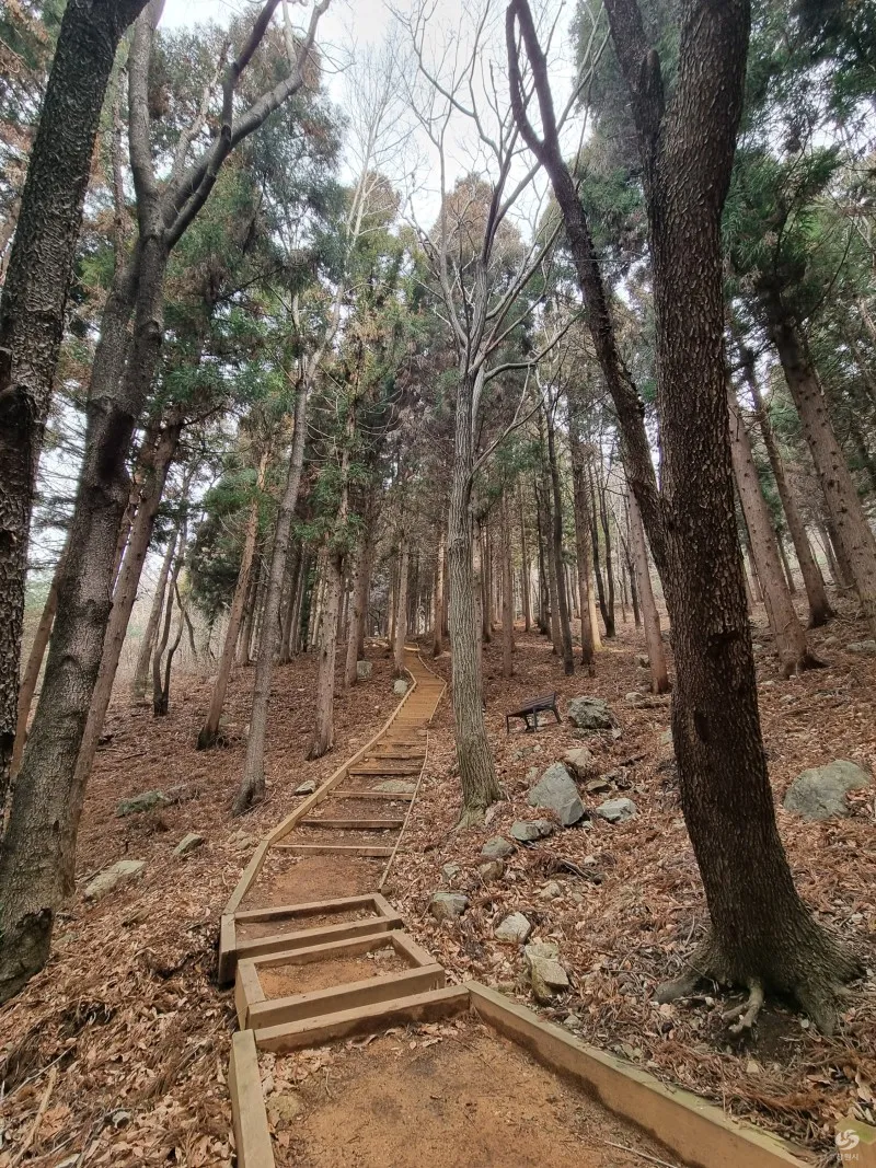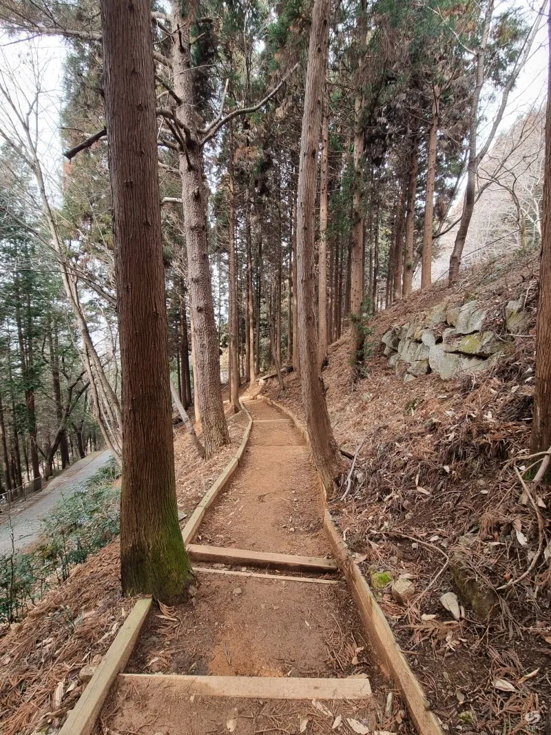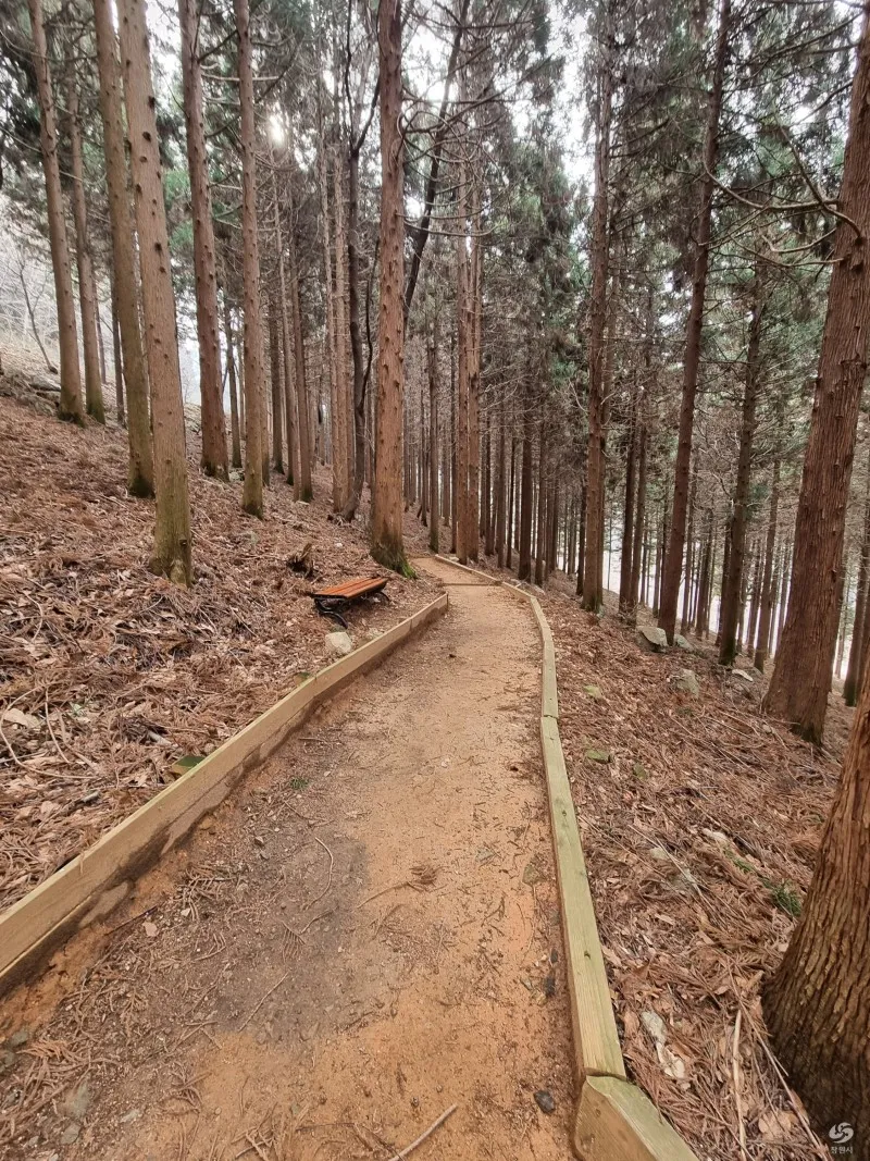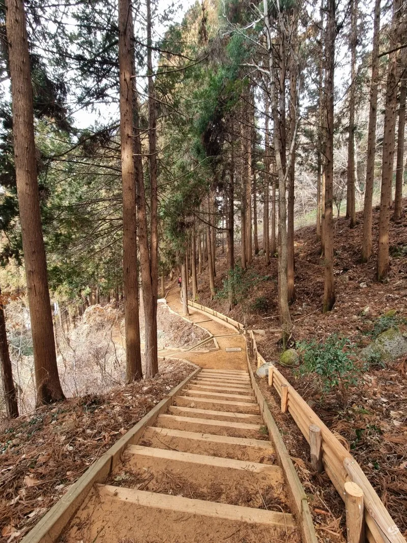 어느 정도 걸어가면 여러 갈래의 길도 나옵니다. 저는 아래쪽으로 쭉 길을 가봅니다. 또 다른 아래 입구도 나오고 오른쪽으로 보면 3갈래의 황톳길로 나눠지는 것을 볼 수 있습니다.