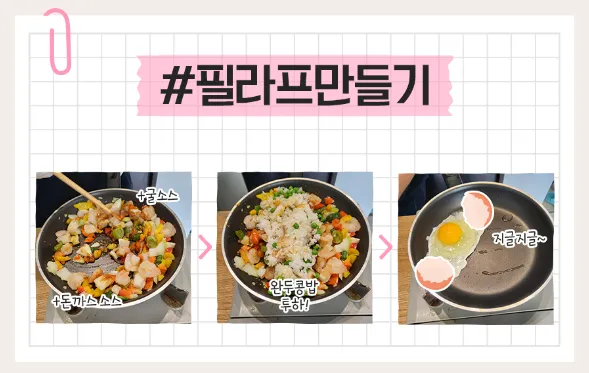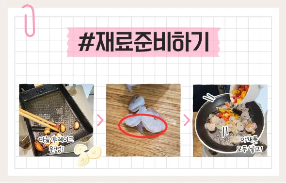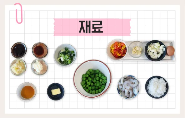 완두콩, 새우, 파프리카, 마늘, 양파, 달걀, 대파, 밥 한 공기, 버터, 다진 마늘 1T, 돈까스소스 1T, 굴소스 1T, 치킨스톡 1T, 마요네즈