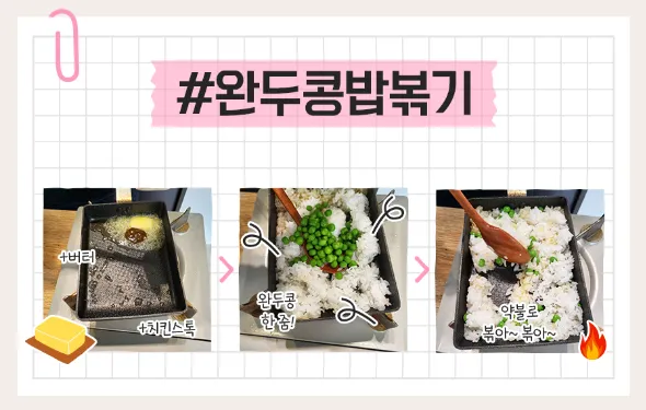 2. 밥 한 공기와 완두콩 한 줌을 넣어 약불에 살살~ 볶아주세요!