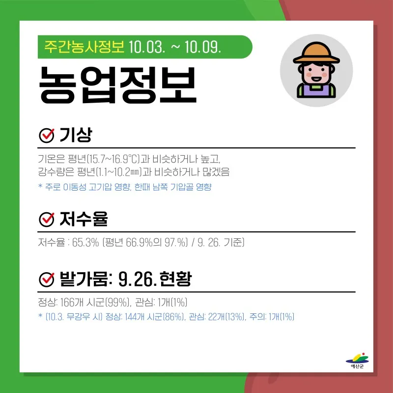 • (기상) 기온은 평년(15.7~16.9℃)과 비슷하거나 높고, 강수량은 평년(1.1~10.2㎜)과 비슷하거나 많겠음 * 주로 이동성 고기압 영향, 한때 남쪽 기압골 영향 • (저수율) 저수율 : 65.3% (평년 66.9%의 97.%) / 9. 26. 기준) • (밭가뭄: 9.26. 현황) 정상: 166개 시군(99%), 관심: 1개(1%) * (10.3. 무강우 시) 정상: 144개 시군(86%), 관심: 22개(13%), 주의: 1개(1%) |
