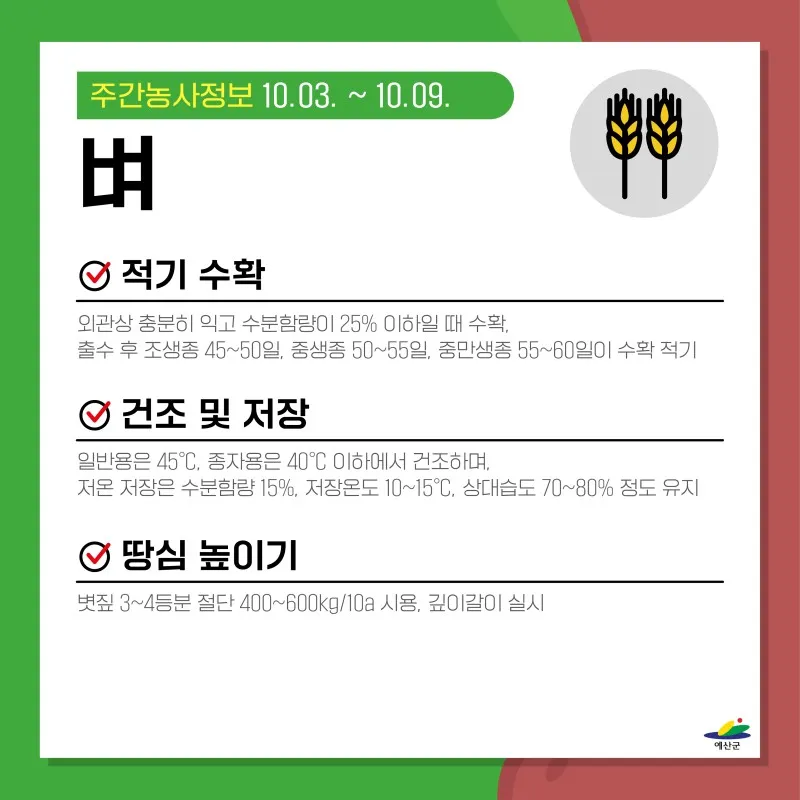 • (적기 수확) 외관상 충분히 익고 수분함량이 25% 이하일 때 수확, 출수 후 조생종 45~50일, 중생종 50~55일, 중만생종 55~60일이 수확 적기 • (건조 및 저장) 일반용은 45℃, 종자용은 40℃ 이하에서 건조하며, 저온 저장은 수분함량 15%, 저장온도 10~15℃, 상대습도 70~80% 정도 유지 • (땅심 높이기) 볏짚 3~4등분 절단 400~600kg/10a 시용, 깊이갈이 실시 |
