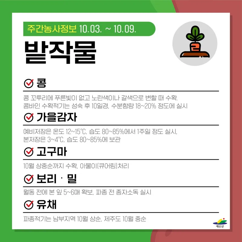 • (콩) 콩 꼬투리에 푸른빛이 없고 노란색이나 갈색으로 변할 때 수확. 콤바인 수확적기는 성숙 후 10일경, 수분함량 18~20% 정도에 실시 • (가을감자) 예비저장은 온도 12~15℃, 습도 80~85%에서 1주일 정도 실시, 본저장은 3~4℃, 습도 80~85%에 보관 • (고구마) 10월 상중순까지 수확, 아물이(큐어링)처리 • (보리‧밀) 월동 전에 본 잎 5~6매 확보, 파종 전 종자소독 실시 • (유채) 파종적기는 남부지역 10월 상순, 제주도 10월 중순 |