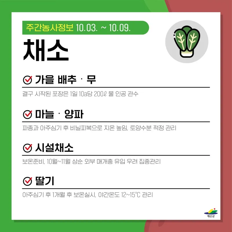 • (가을 배추‧무) 결구 시작된 포장은 1일 10a당 200ℓ 물 인공 관수 • (마늘‧양파) 파종과 아주심기 후 비닐피복으로 지온 높임, 토양수분 적정 관리 • (시설채소) 보온준비, 10월~11월 상순 외부 매개충 유입 우려 집중관리 • (딸기) 아주심기 후 1개월 후 보온실시, 야간온도 12~15℃ 관리 |