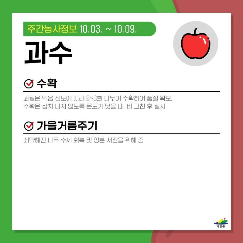 • (수확) 과실은 익음 정도에 따라 2~3회 나누어 수확하여 품질 확보. 수확은 상처 나지 않도록 온도가 낮을 때, 비 그친 후 실시 • (가을거름주기) 쇠약해진 나무 수세 회복 및 양분 저장을 위해 줌 |