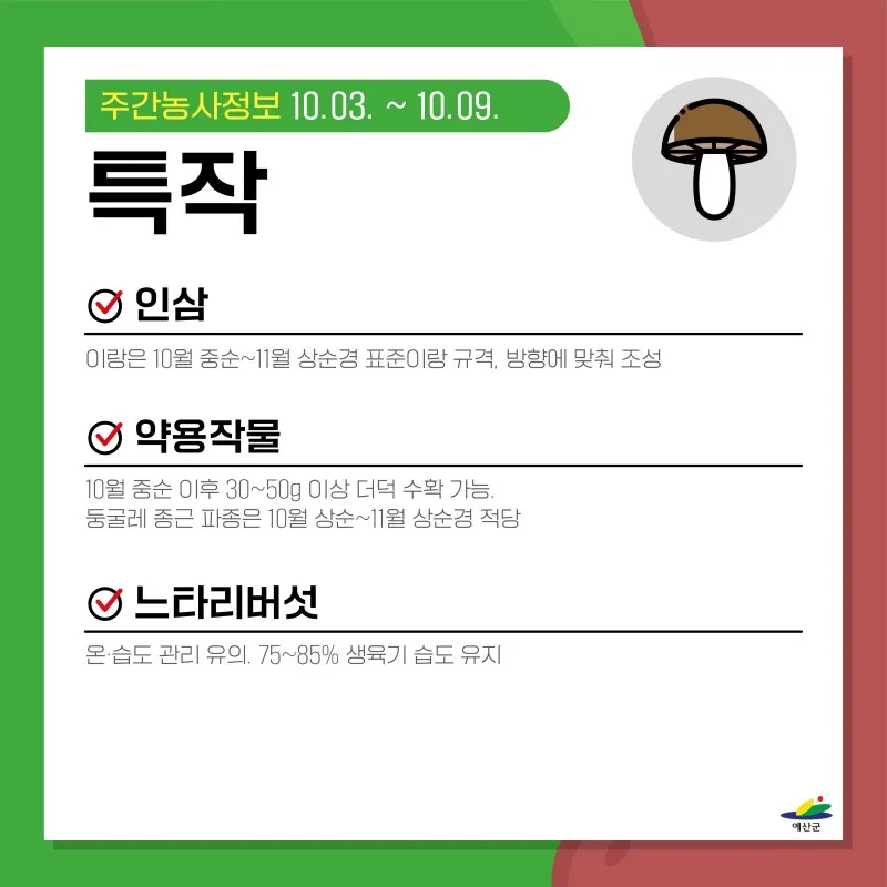 • (인삼) 이랑은 10월 중순∼11월 상순경 표준이랑 규격, 방향에 맞춰 조성 • (약용작물) 10월 중순 이후 30∼50g 이상 더덕 수확 가능. 둥굴레 종근 파종은 10월 상순∼11월 상순경 적당 • (느타리버섯) 온·습도 관리 유의. 75∼85% 생육기 습도 유지 |