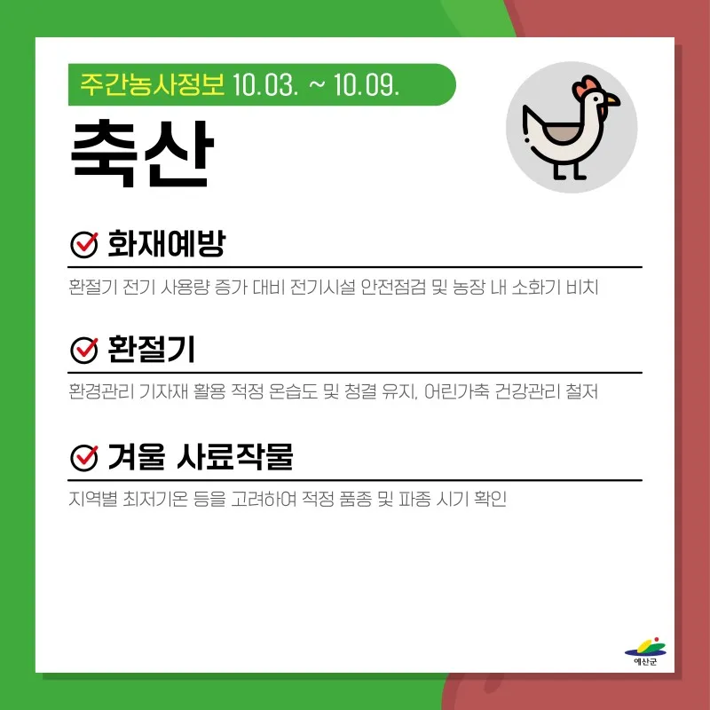 • (화재예방) 환절기 전기 사용량 증가 대비 전기시설 안전점검 및 농장 내 소화기 비치 • (환절기) 환경관리 기자재 활용 적정 온습도 및 청결 유지, 어린가축 건강관리 철저 • (겨울 사료작물) 지역별 최저기온 등을 고려하여 적정 품종 및 파종 시기 확인 |