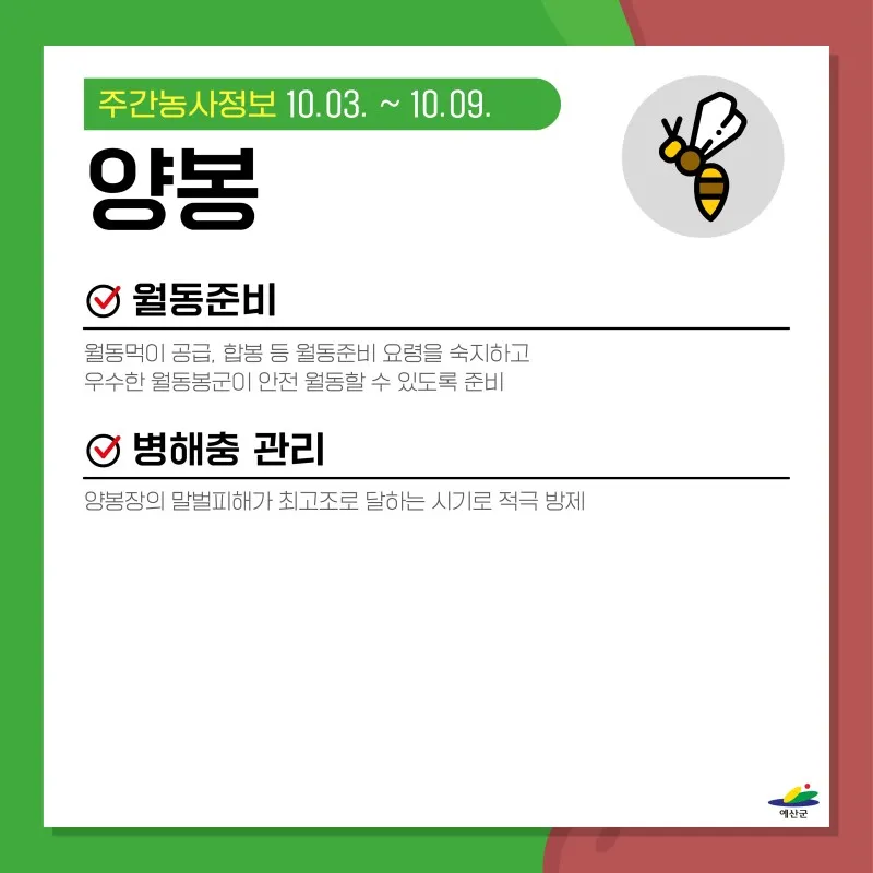 • (월동준비) 월동먹이 공급, 합봉 등 월동준비 요령을 숙지하고 우수한 월동봉군이 안전 월동할 수 있도록 준비 • (병해충 관리) 양봉장의 말벌피해가 최고조로 달하는 시기로 적극 방제 |