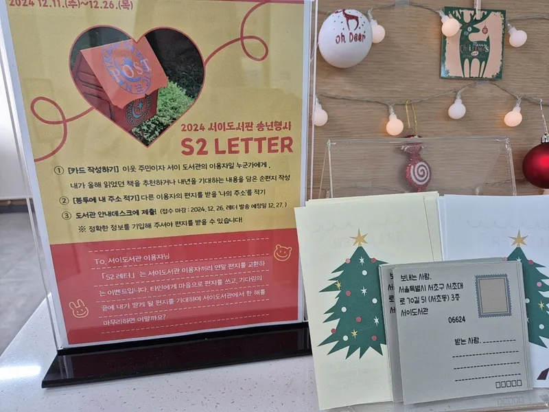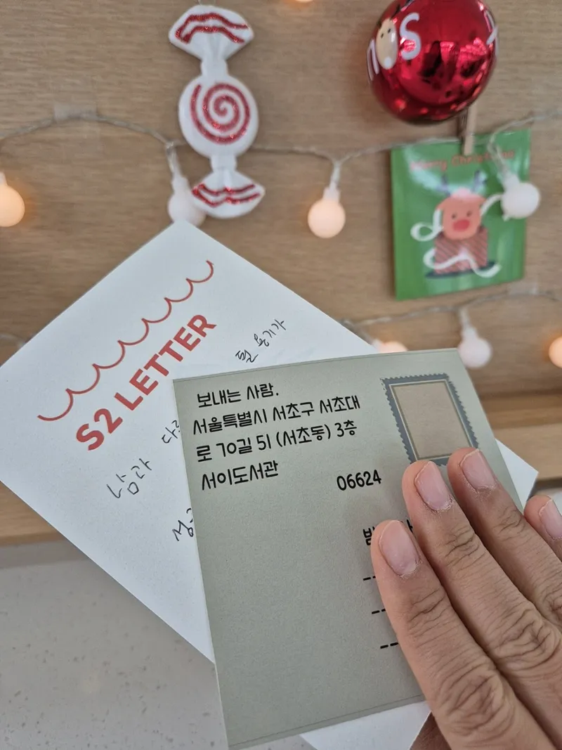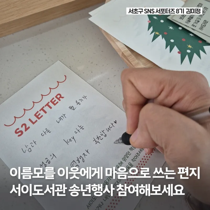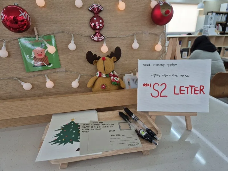 12월, 한 해를 마무리하는 계절에 서이도서관에서 열린 특별한 송년행사 S2 Letter에 참여했습니다. S2 Letter는 서이도서관이 진행하는 연말 프로그램으로, 도서관 이용자인 서초구 이웃주민에게 편지를 쓰며 한 해를 되돌아보는 시간과 따뜻한 마음을 느끼게 해 주는 행사인데요.