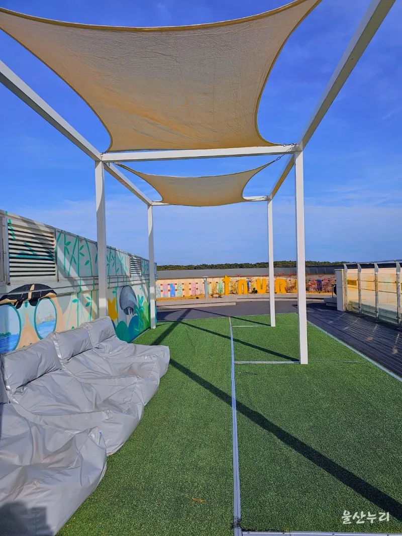 옥상에 올라가면 전망대에 온 것처럼 울산 대왕암이 한눈에 보이는데요. 멀리 출렁다리에서 보는 울산 바다와 옥상에서 보는 울산 바다는 느낌이 또 다릅니다. 아이와 안전하게 옥상에서 울산 전경도 구경하시고요. 커피나 간단한 음료를 준비하셔서 카페처럼 이용을 하셔도 됩니다.