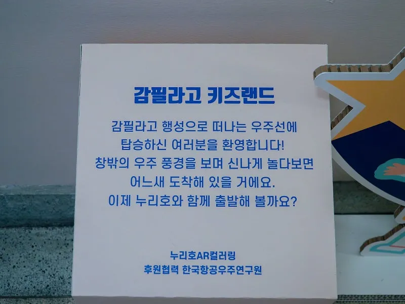 감필라고 키즈랜드에서는 한국항공우주연구원과 협력하여 누리호 AR 컬러링 등 아이들이 자연스럽게 과학과 친해질 수 있는 프로그램이 마련되어 있었습니다.