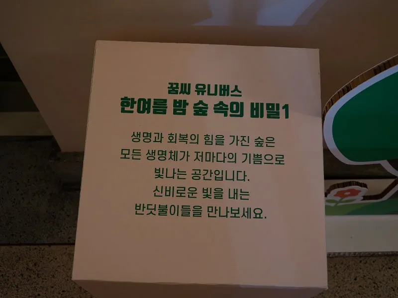 꿈씨 유니버스는 미디어, 자연, 우주의 경계를 허무는 듯한 혁신적인 미디어 아트 공간입니다. 관람객의 움직임에 따라 형태를 변화시키는 반딧불이 영상은 마치 살아있는 생명체처럼 느껴지며, 시각적 아름다움을 넘어 감동을 선사했습니다.