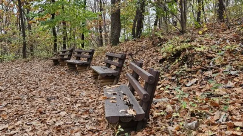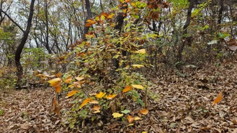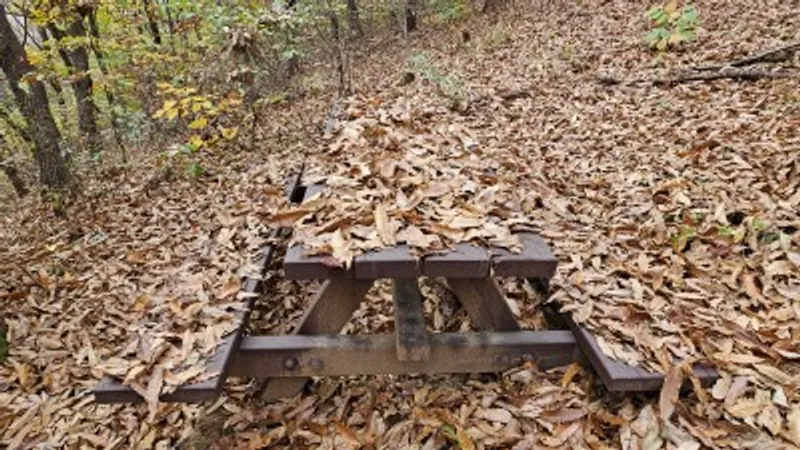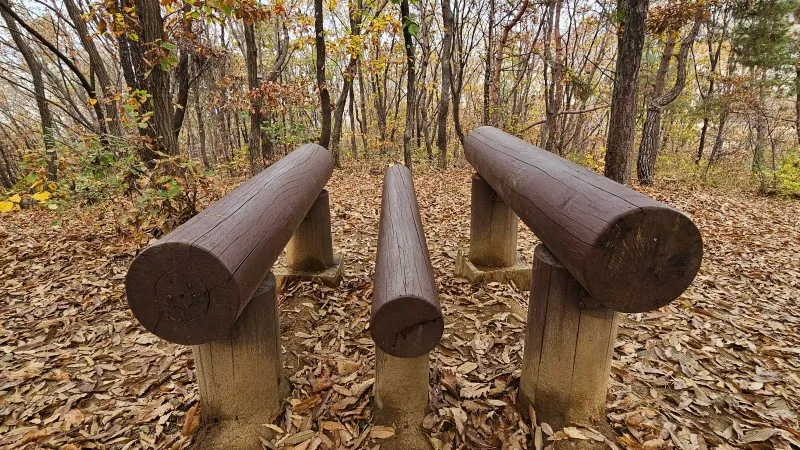 굴밤나무 등의 다양한 활엽수는 이미 잎을 떨군지 오래이고 계단을 따라 오르니 산속에 이런 테이블이 서너 개 있어 자주 쉬어 가는 곳입니다. 사방의 경치가 좋고 이곳에 앉으면 멀리 석성산 정상이 보이는데요. 이곳에서 석성산을 오르려면 용인시청에서 오르는 등반길보다는 좀 더 험준한 편이고 2시간 이상 쉬지 않고 험한 길로 올라가야 합니다.