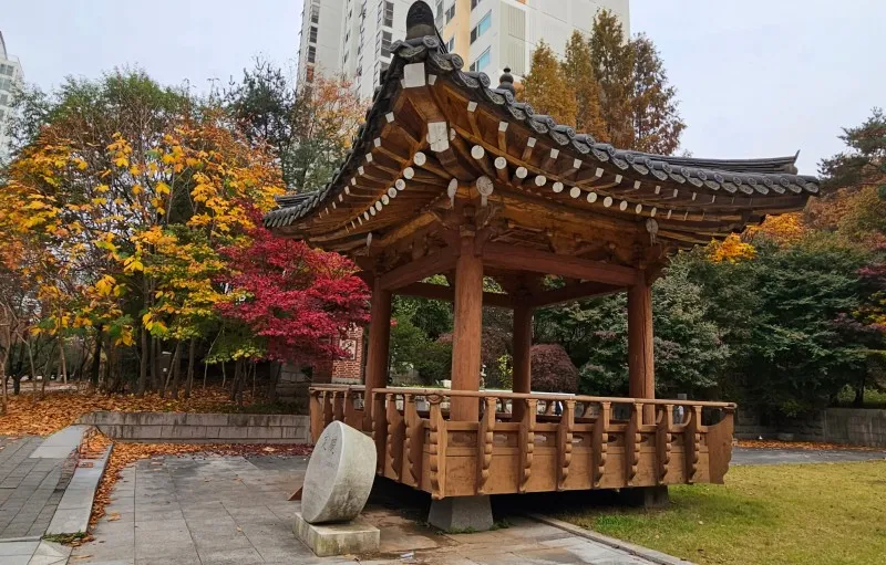 용인시 동백지구는 석성산을 중심으로 산 가까이에는 전원주택지와 타운하우스가 조성되어 있고 동백호수 쪽을 중심으로 아파트가 밀집되어 있는데요. 어느 곳이든 자연이 가까워 자연 속 힐링 도시라는 느낌을 받는 곳이랍니다. 무관 묘역을 지나면 전원주택지가 이어지는데 어디선가 하하 호호 아이들의 웃음소리가 들리는 꽃내공원입니다. 산을 배경으로 조성되어 있어 공원의 모습만으로도 힐링이 되는 곳인데 가을 단풍이 소복하게 내려앉아 그 정취는 배가 됩니다.