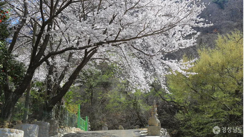 구절산 폭포암으로 오르는 도로 옆에는 봄을 알리는 벚꽃과 빨간 동백꽃이 아름답게 피어 폭포암과 출렁다리를 찾은 나들이객들의 눈을 즐겁게 하고 있습니다.
