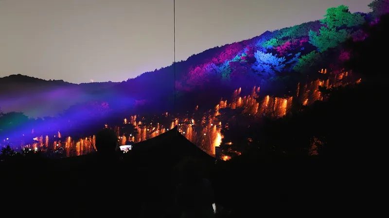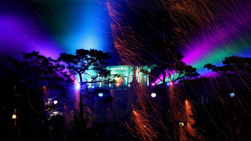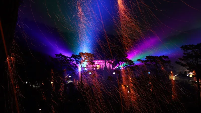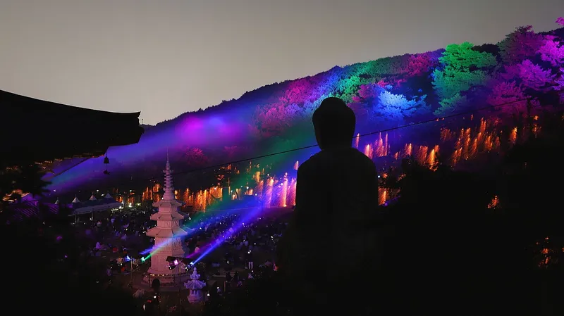 대웅보전 앞에서 쏘는 유색 레이저 불빛이 낙화와 멋진 조화를 이루네요.