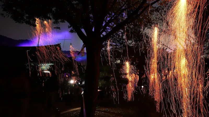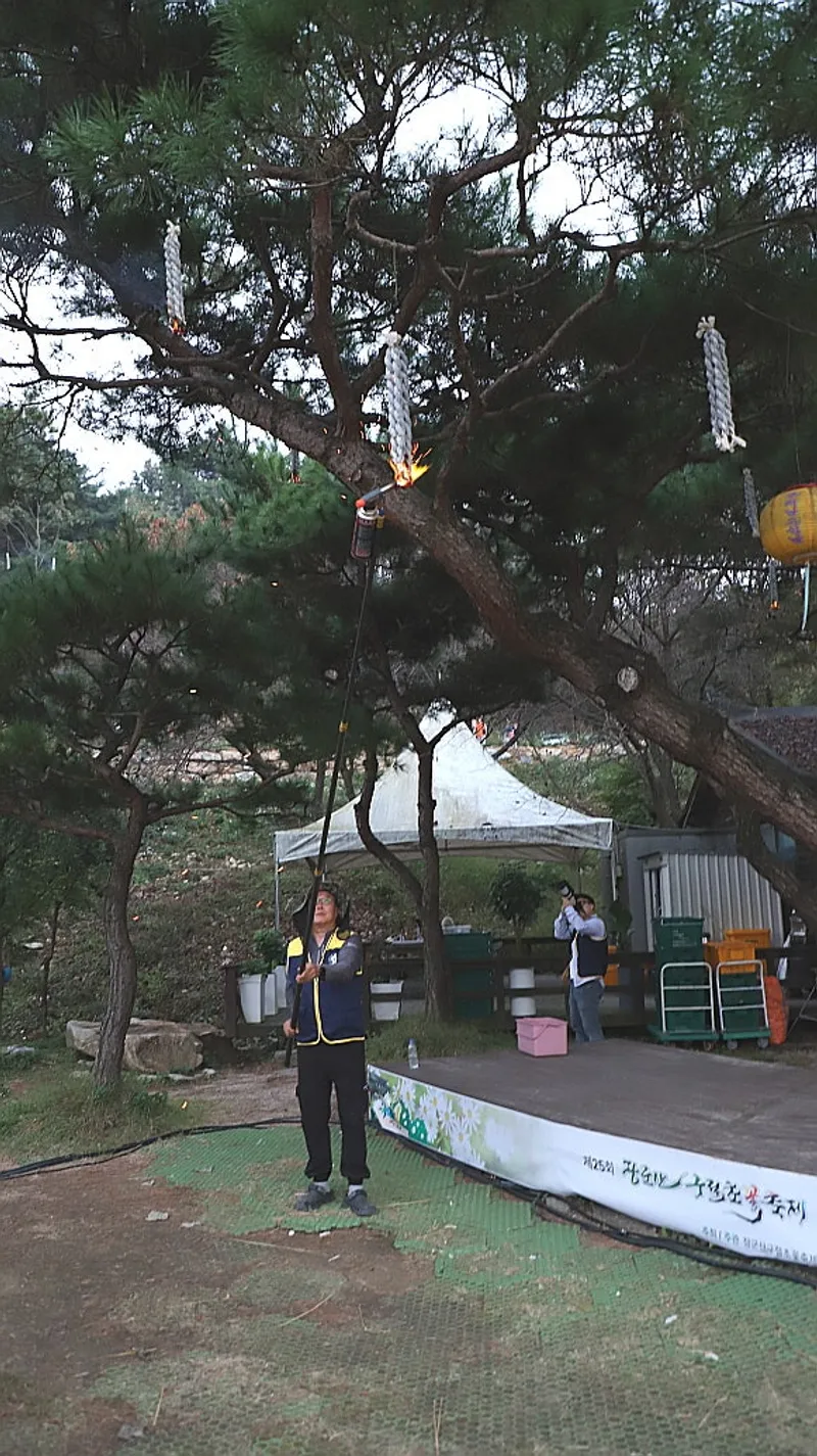 일몰과 때를 같이 하여 낙화봉에 점화합니다. 나뭇가지에 매달아 놓은 수많은 낙화봉에 장대를 이용하여 일일이 사람 손으로 점화를 하니 점화에도 시간이 오래 걸립니다.