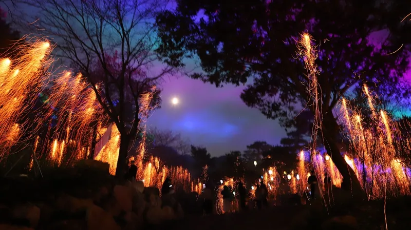 참 아름답고 신비로운 밤입니다. 방문객들은 낙화가 쏟아지는 나무 아래를 걸으며 낙화의 아름다움을 만끽합니다.