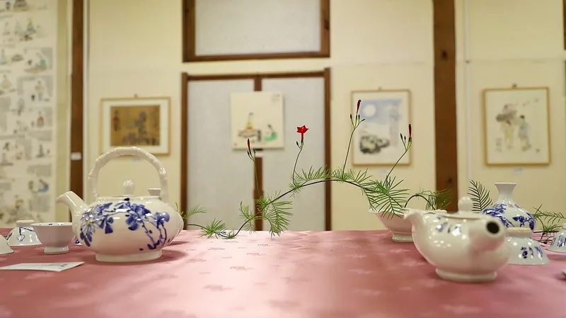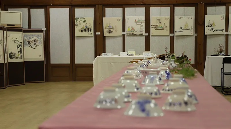 벽면에는 많은 그림이 걸려 있고 가운데는 예쁜 다기가 전시되어 있습니다.