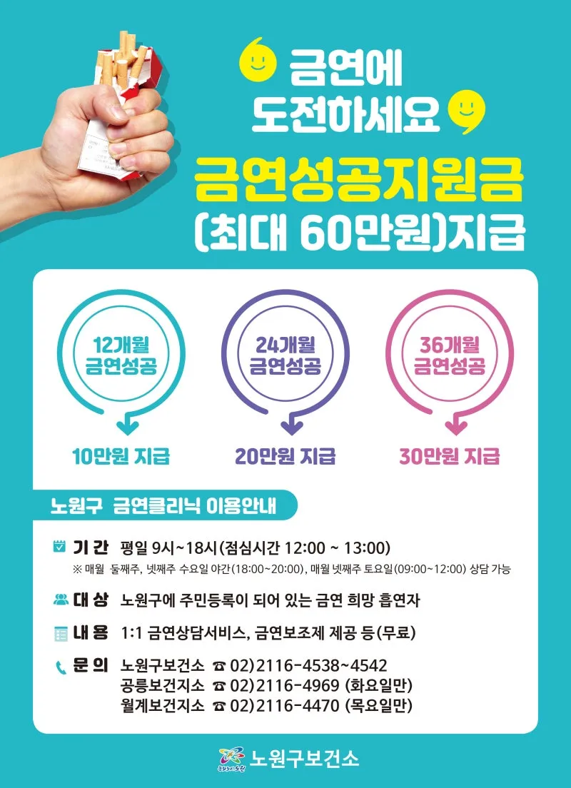 노원구 금연클리닉, 단계별(12/24/36개월) 금연 성공지원금 지급! 실패 없는 금연을 위한 선택, 성공축하금, 최대 60만원, 행동 물품 등