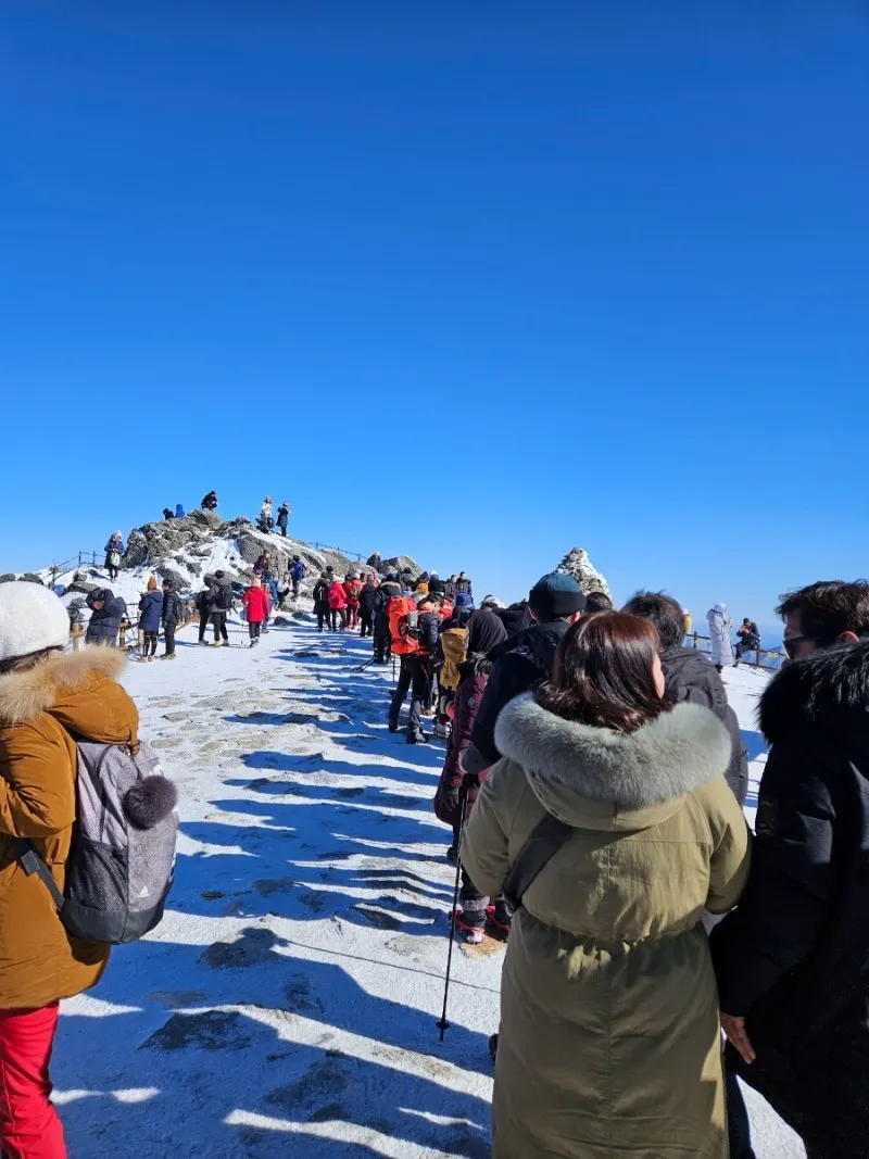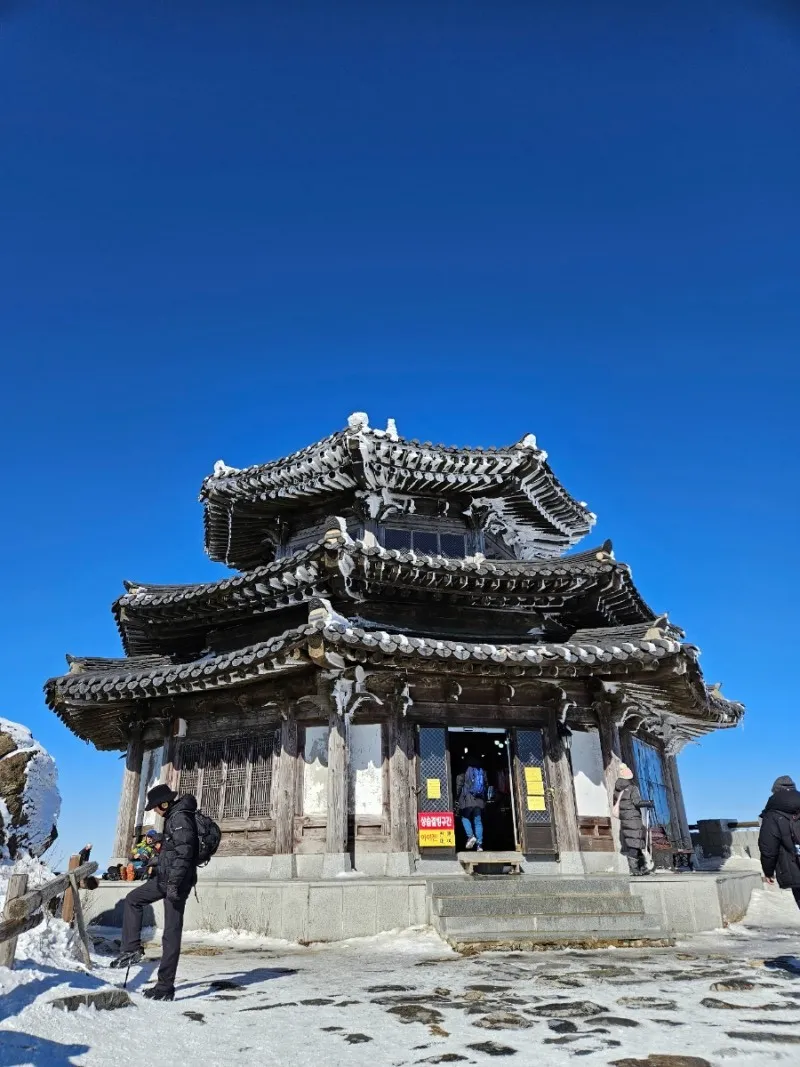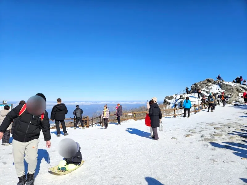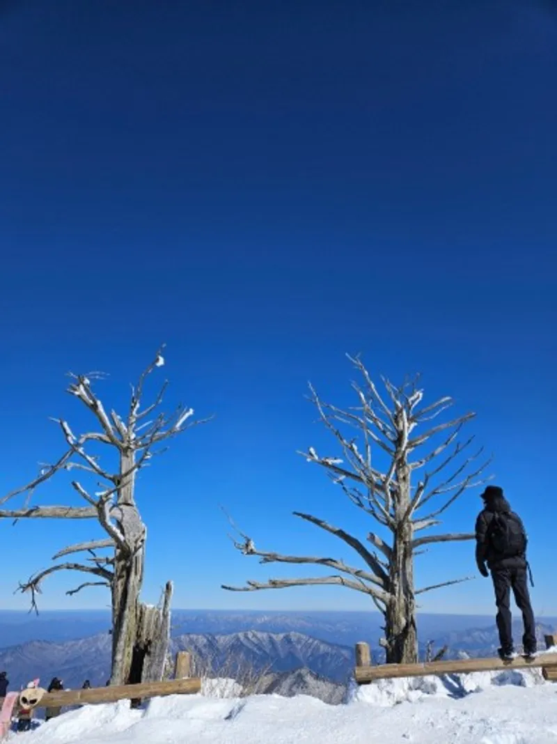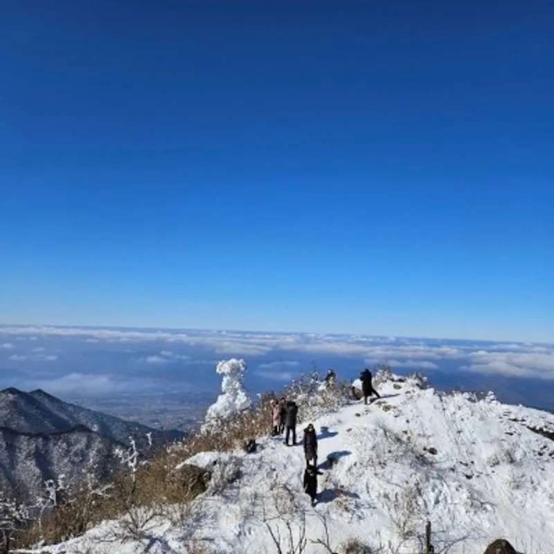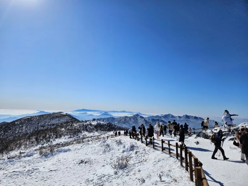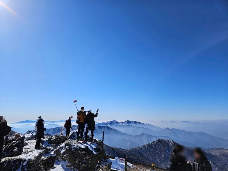 드디어 오늘의 최종 목적지인 향적봉 정상에 도착했습니다. 눈부시게 푸른 창공 아래로 눈 덮인 설산과 몽실몽실한 구름을 눈에 담으며 ‘역시 오기를 잘했다’ 생각합니다.