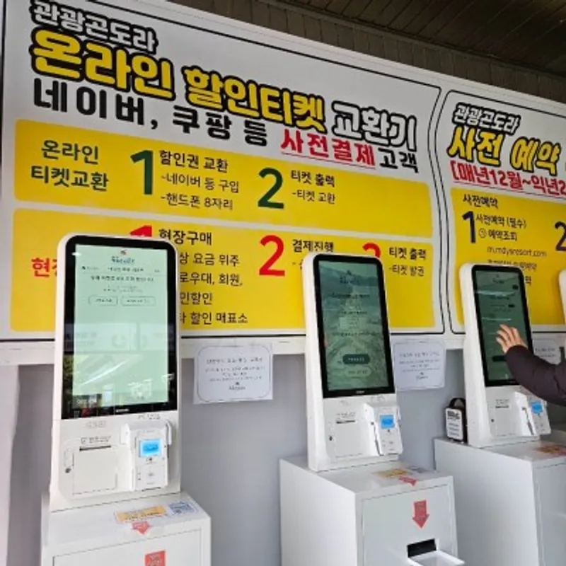 현장 매표소 좌측으로는 저처럼 네이버 할인 예매를 한 경우 종이 탑승권으로 바꿀 수 있는 무인 교환기가 3대 있습니다. 카카오톡으로 전송받은 URL의 바코드 또는 구매자의 휴대폰 정보를 입력하면 종이 탑승권이 나오는데 재발행이 어렵기 때문에 분실하지 않도록 유의해야 합니다.